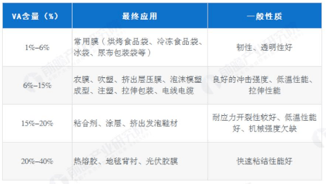 EVA性能與乙酸乙烯酯(VA)含量有很大關(guān)系,VA含量增加,回彈性、柔韌性、黏合性、透明性、溶解性、耐應(yīng)力開裂性和沖擊性能都會(huì)提高;VA含量降低時(shí)EVA剛性、耐磨性及電絕緣性都會(huì)增加。一般來說,VA含量在10%-20%范圍時(shí)為塑性材料,而VA含量超過30%時(shí)為彈性材料。